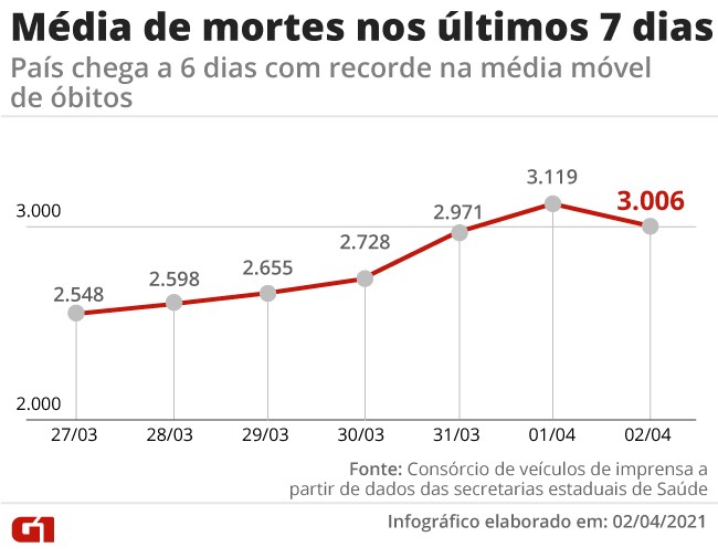 Já são 72 dias seguidos com a média móvel de mortes acima da marca de mil; o país completa agora 17 dias com essa média acima dos 2 mil mortos por dia; é o sétimo dia com a média acima da marca de 2,5 mil.