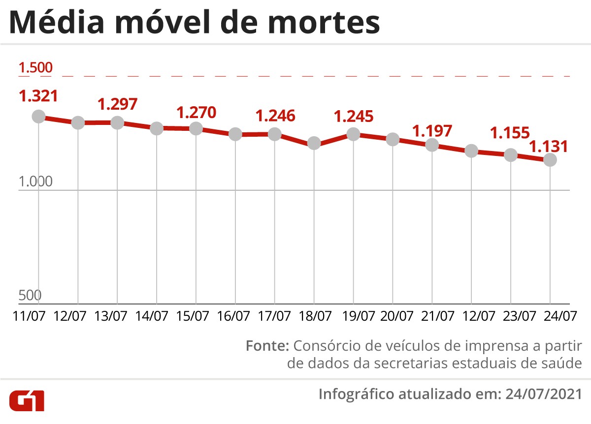 País contabiliza 549.500 óbitos e 19.666.902 casos de coronavírus, segundo balanço do consórcio de veículos de imprensa com dados das secretarias de Saúde. São, em média, 1.168 mortos por dia pela doença. O Brasil registrou 1.080 mortes por Covid-19 nas últimas 24 horas, totalizando neste sábado (24) 549.500 óbitos desde o início da pandemia. Com isso, a média móvel de mortes nos últimos 7 dias chegou a 1.168. Em comparação à média de 14 dias atrás, a variação foi de -10% e aponta tendência de estabilidade.