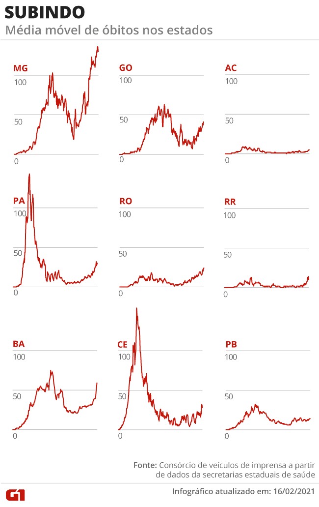 Nove estados estão com alta nas mortes: MG, GO, AC, PA, RO, RR, BA, CE e PB.