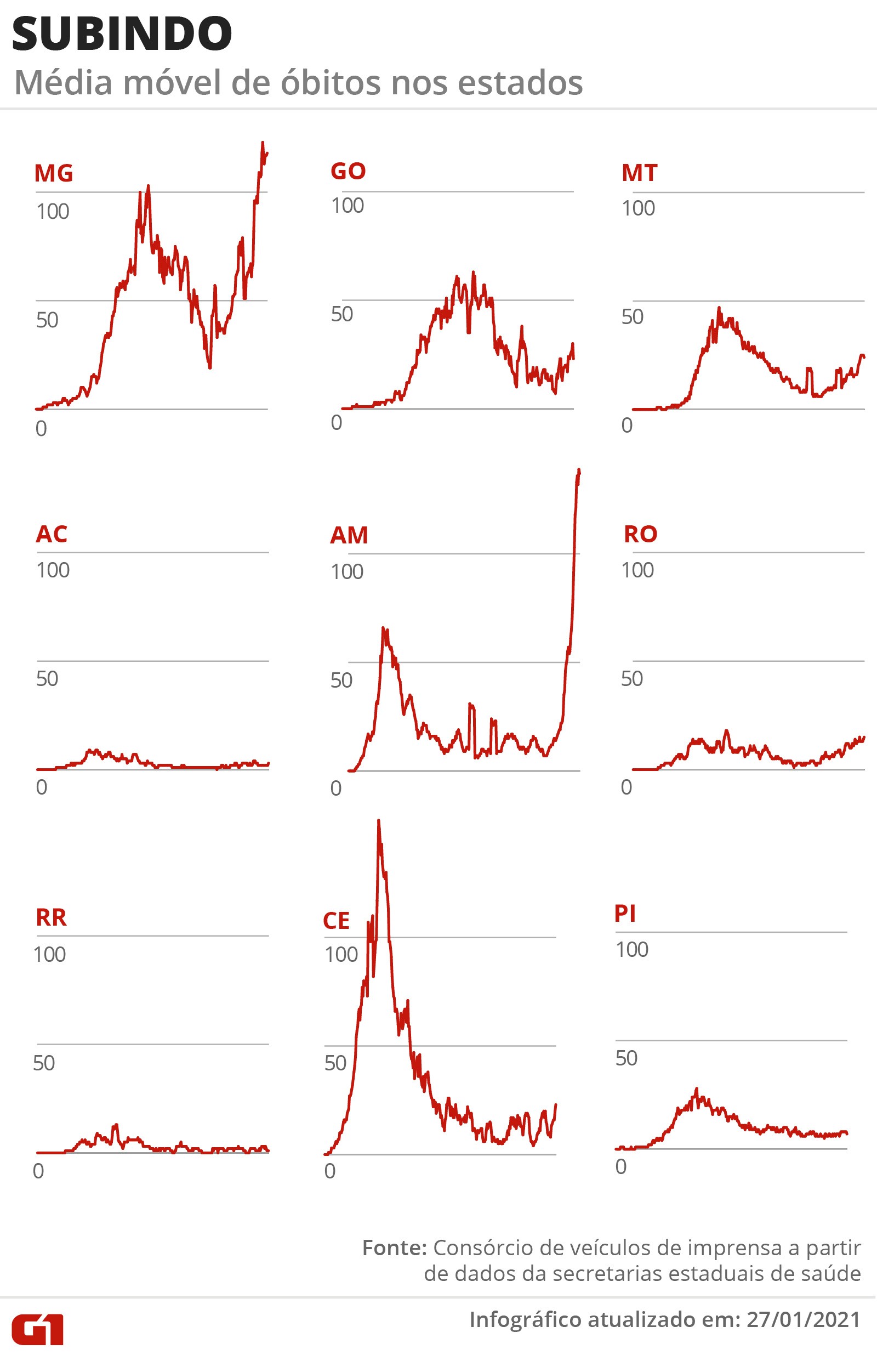 Nove estados estão com alta nas mortes: MG, GO, MT, AC, AM, RO, RR, CE e PI.