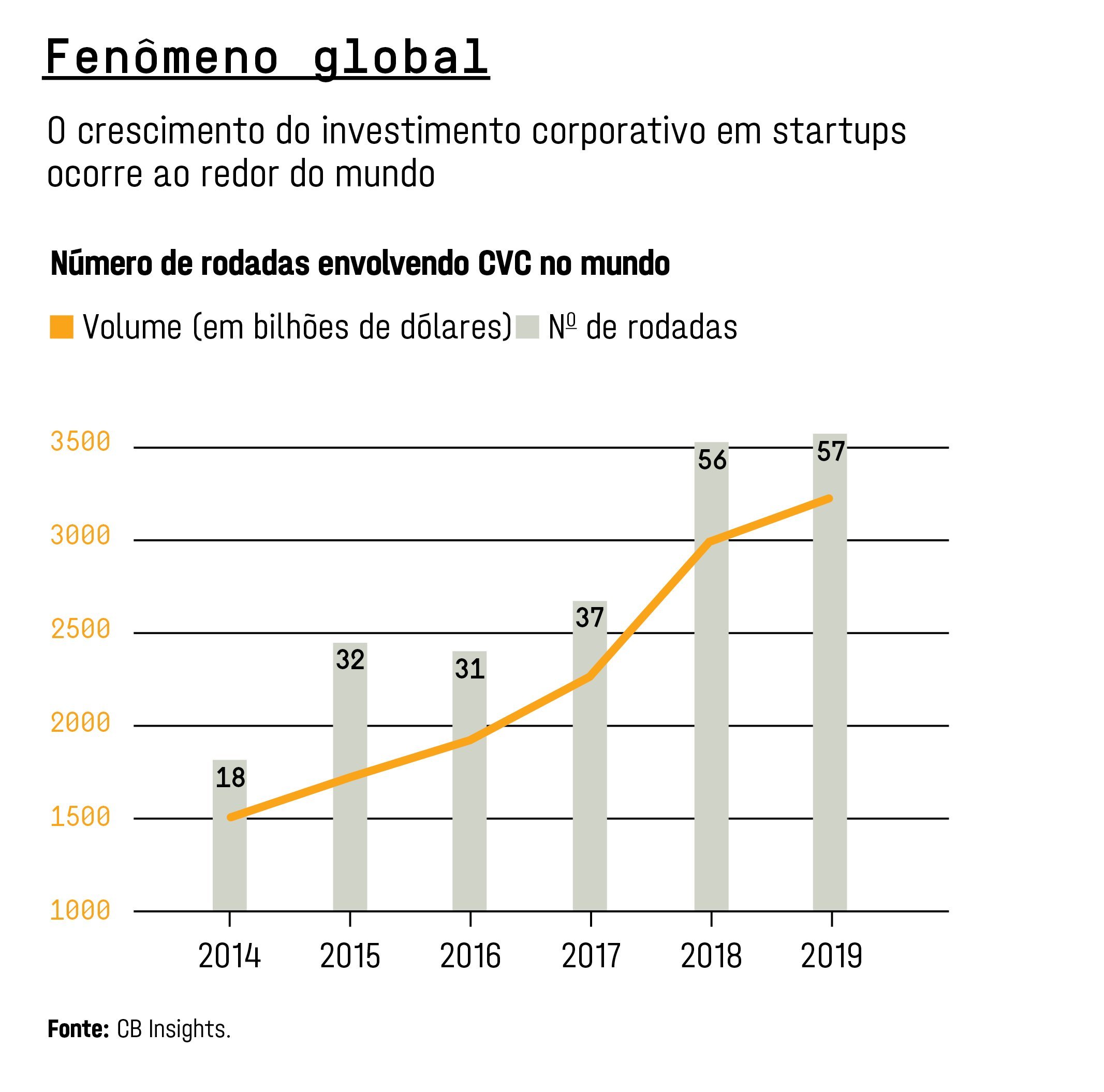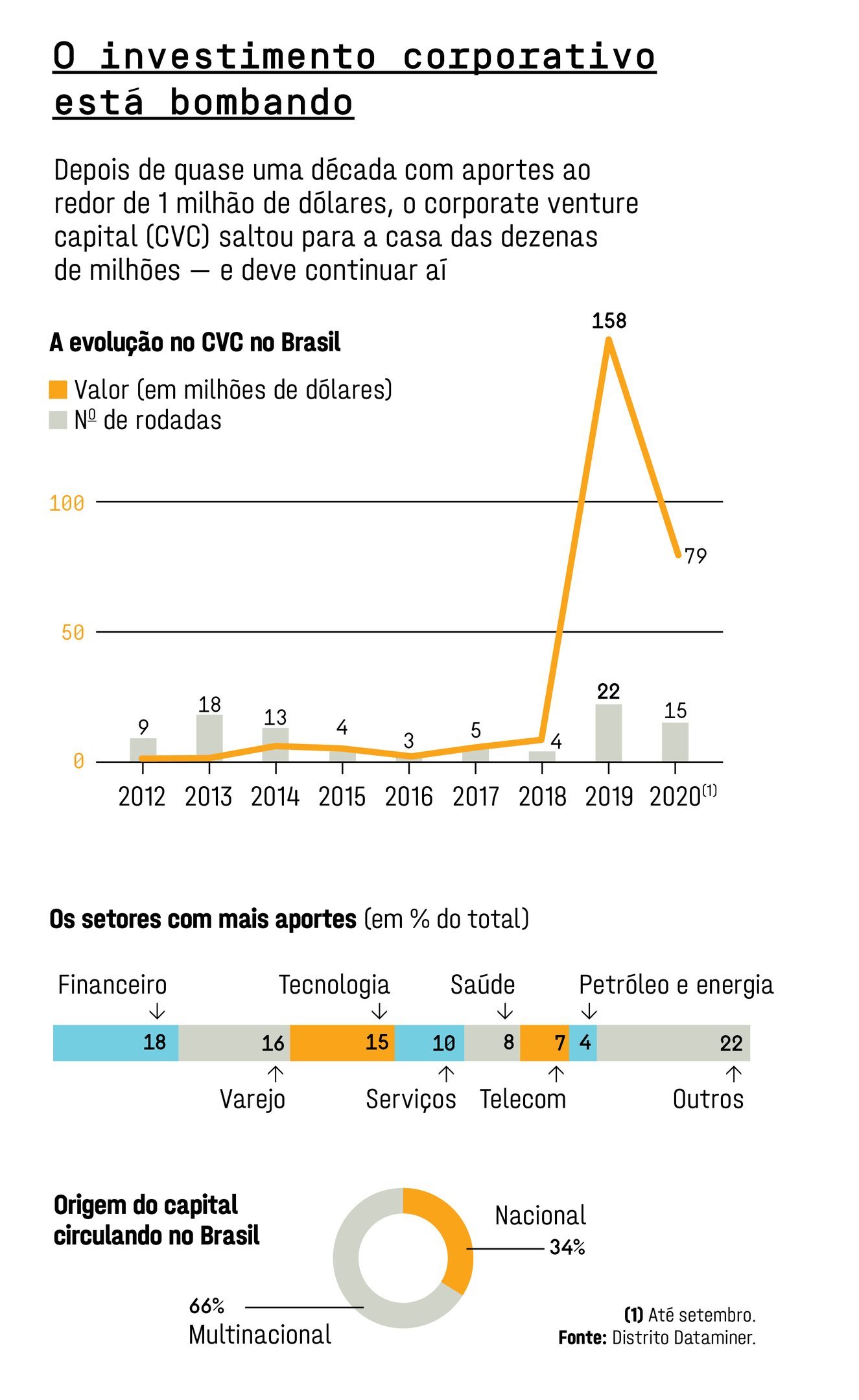 No Brasil, os valores aportados em corporate venture subiram drasticamente nos últimos anos e dão sinais de ter ganhado força com a pandemia. De pouco menos de 1 milhão de dólares em 2016, o setor movimentou 158 milhões de dólares três anos mais tarde. O salto foi puxado por grandes bancos, operadoras de telefonia e algumas varejistas. Em 2019, o banco BV e outros investidores colocaram 95 milhões de dólares na fintech Neon. Com a pandemia escancarando a necessidade de muitas empresas de acelerar a inovação interna para fazer frente às novas demandas abertas pelo isolamento social, o corporate venture manteve-se em alta. De janeiro a setembro do ano passado, grandes empresas despejaram 79 milhões de dólares em startups brasileiras. Sete em cada dez empresas de médio e grande porte aumentaram o interesse em investir em startups ao longo de 2020, segundo uma pesquisa da associação de investidores BR Angels.