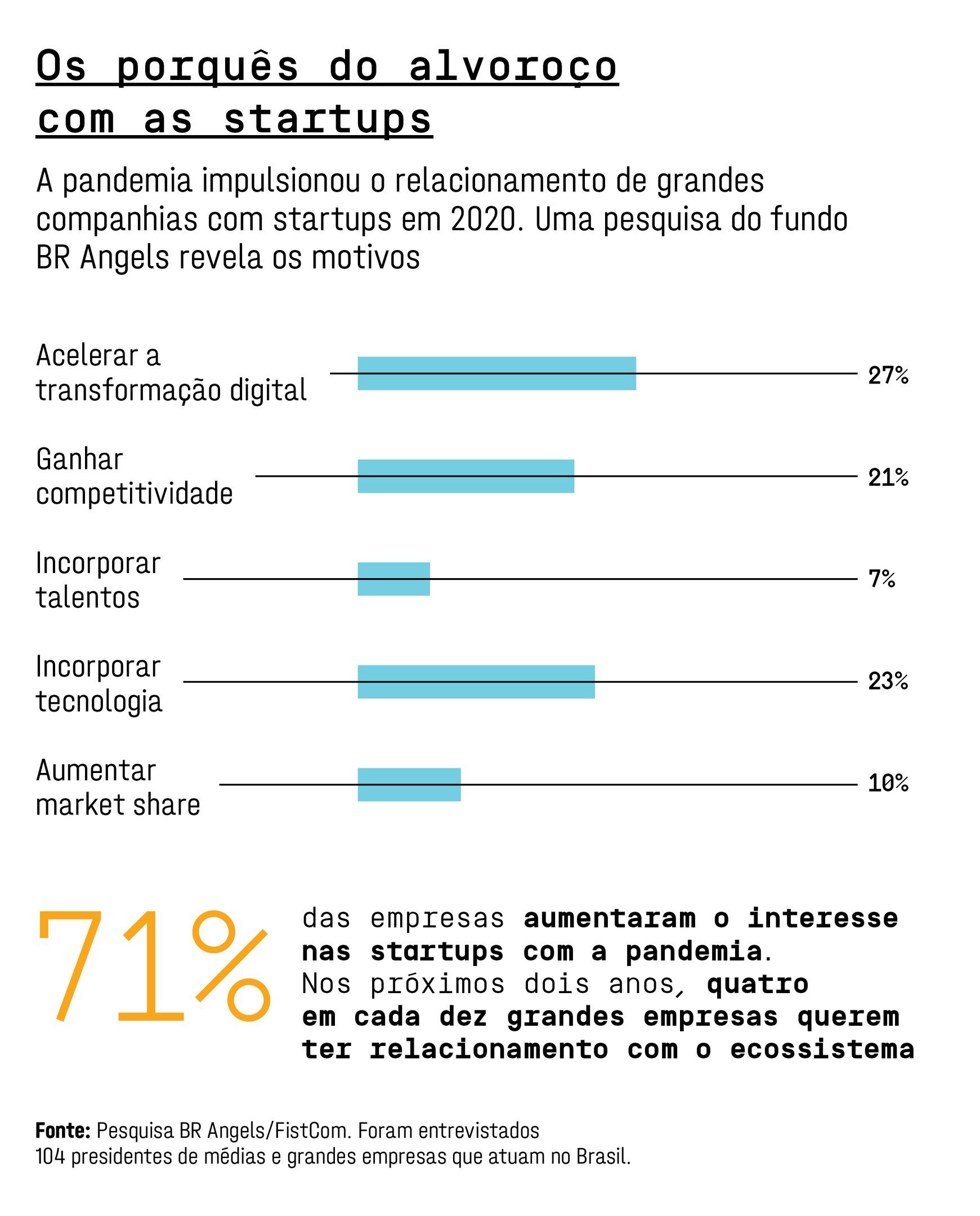 No longo prazo, a proliferação de ideias tiradas do papel via corporate venture deve provocar mudanças tanto para as empresas que patrocinam essas iniciativas como para as startups que recebem esses recursos. Para o lado das empresas, um efeito será a cobrança maior dos conselhos de administração por iniciativas de inovação que as aproximem de startups com potencial de mudar o mercado — seja com investimentos, seja com aquisições. Do lado das startups, ter mais empresas atuando com corporate venture será fundamental para dar liquidez. Apesar de 2020 ter visto um recorde de 3,5 bilhões de dólares captados por startups brasileiras, o volume ainda é só 2,4% do recebido pelas startups americanas no período. “Se as grandes empresas não incentivam, toda a inovação do país vem de fora, o que é ruim”, diz Andrea Minardi, professora no Insper. O Marco Legal das Startups, aprovado pela Câmara dos Deputados em dezembro, deve destravar investimentos. O texto dá incentivos fiscais para empresas ligadas a órgãos públicos investirem em startups. “A medida cria um nicho de investimento”, diz Luiz Filipe Aranha, sócio do KLA Advogados. A torcida é para que mais gente apareça como sócia de startups no país.