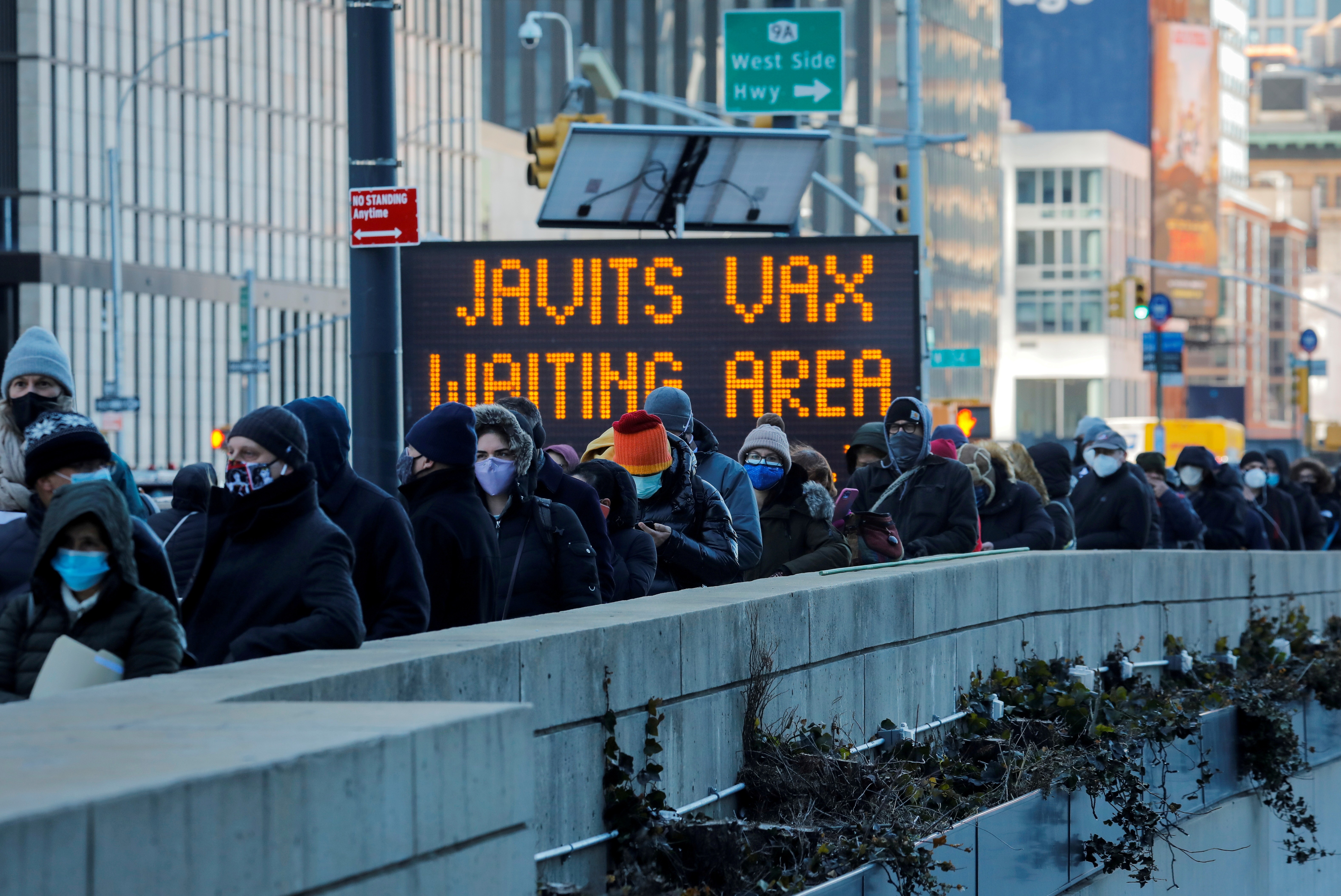 Diretora do CDC pede cautela, mas afirma estar “esperançosa” com queda de 25% nas transmissões da última semana. Pessoas aguardam em fila para serem vacinadas contra a Covid-19 em Nova York, nos EUA, em foto de 2 de março de 2021