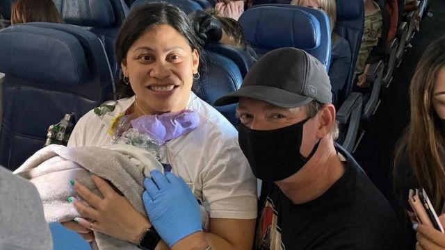 Lavinia “Lavi” Mounga estava em um voo de Salt Lake City, nos EUA, para o Havaí, quando entrou em trabalho de parto. Lavinia “Lavi” Mounga, seu bebê Raymond e o médico Dale Glenn