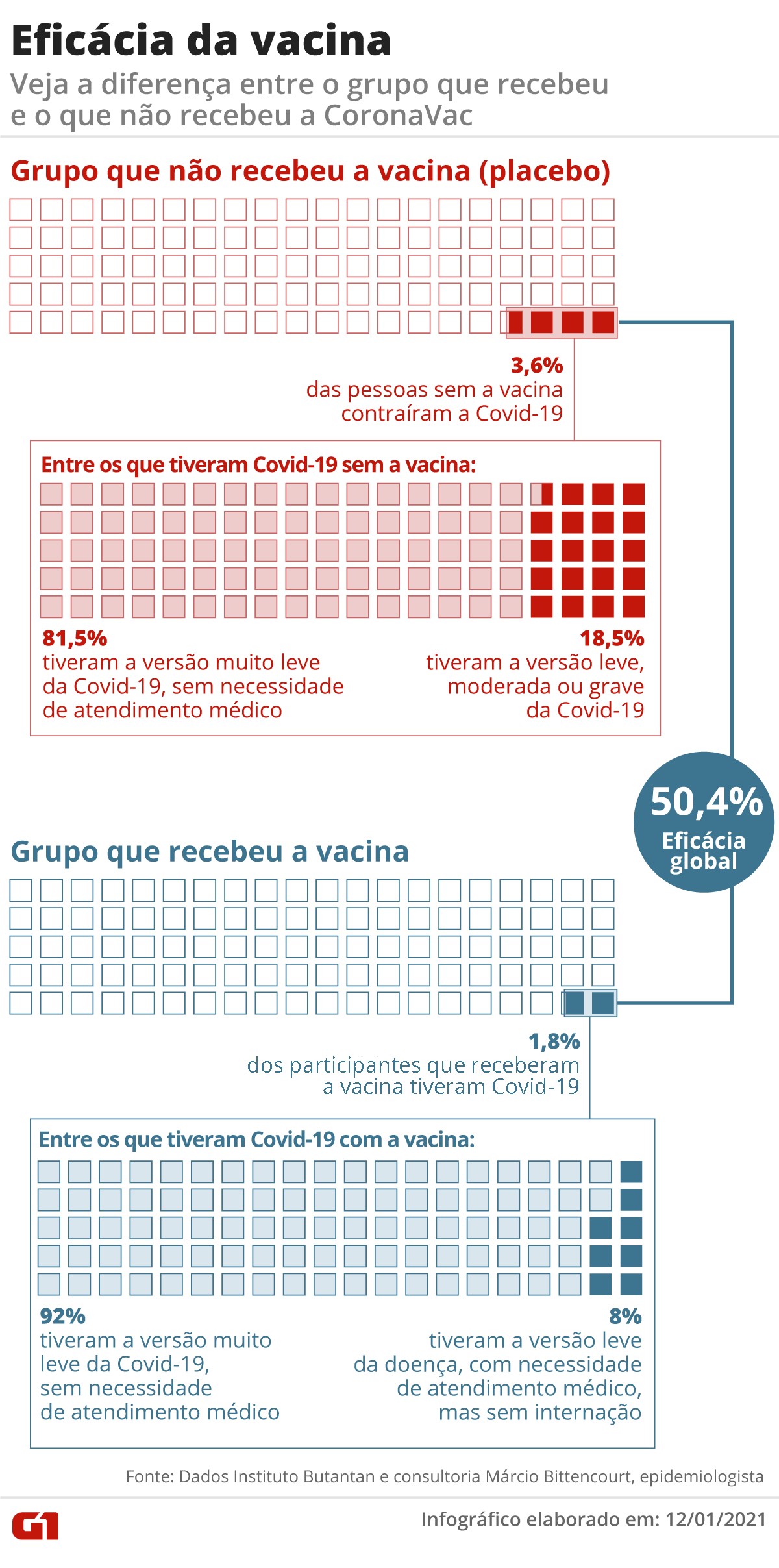 No caso da CoronaVac, uma das vacinas em aplicação no país, Alves explica que o grupo que recebeu a vacina, em comparação com o que não recebeu durante os estudos, não apresentou casos graves da Covid-19. O Instituto Butantan mostra que a grande maioria dos vacinados (92%) apresentaram apenas a versão muito leve da doença, sem precisar ir ao médico.